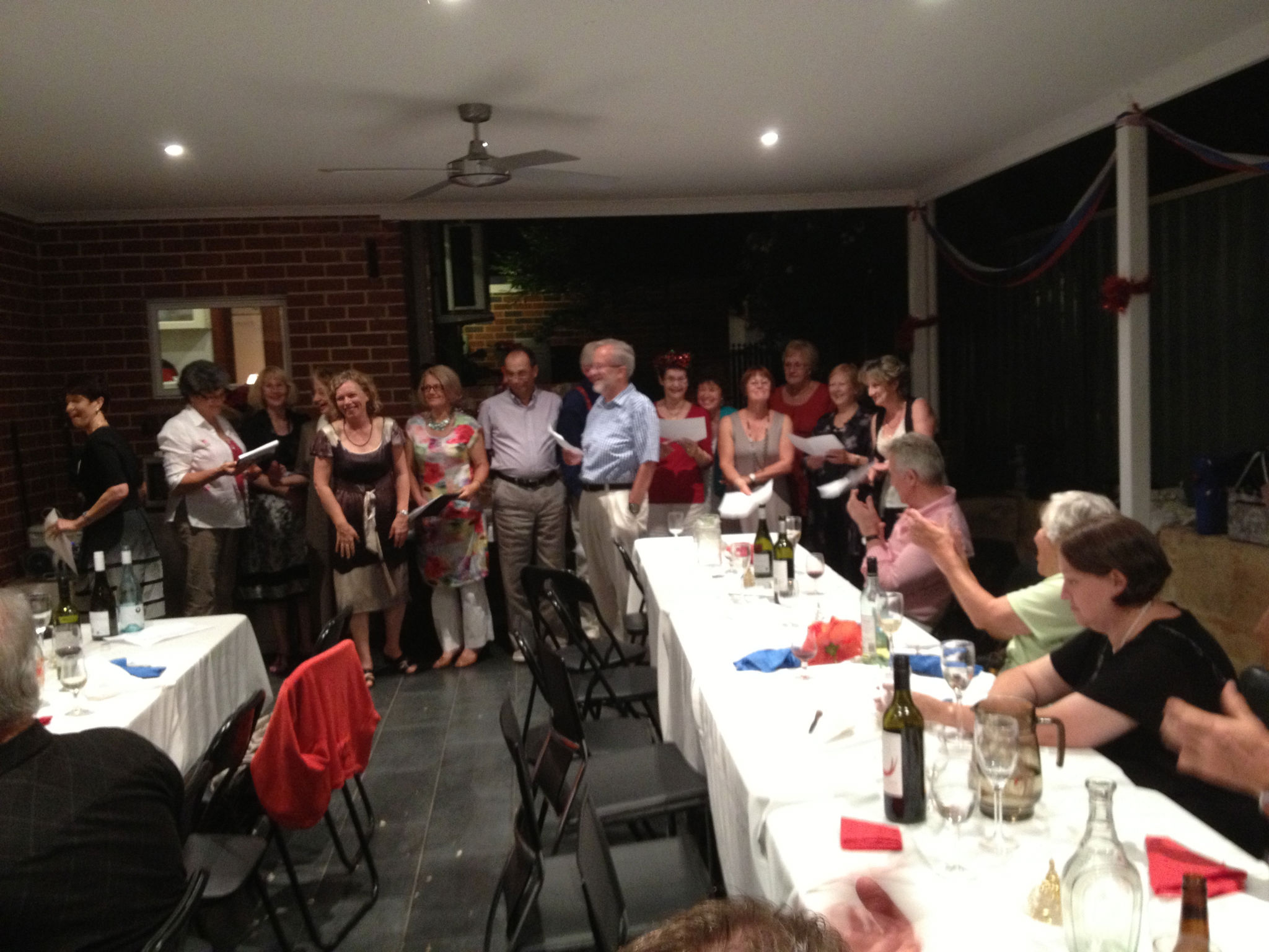 Quelle belle soiree inoubliable! Students from the 3 groups and their spouses, attended a great evening of french culture on the 18th of December 2012, at Marie-Anne’s place to celebrate a great year of learning French, its language, customs,poetry, songs,movies and more..The guests were served a delicately prepared platter of Hors d’Oeuvres, followed by deliciously cooked home-made quiches, salmon mousse for Entree with a salad. Plats de resistance consisted of: Boeuf Bourguignon,Chicken Marengo served with spinach rice and ratatouille. All very tantalising to the eyes and the palate! Of course last but not least, were the mouth-watering desserts such as: Creme Caramel, Fruit tarts,Chocolate cake and ice cream. Needless to say that Champagne and wine were also great companions of the evening.